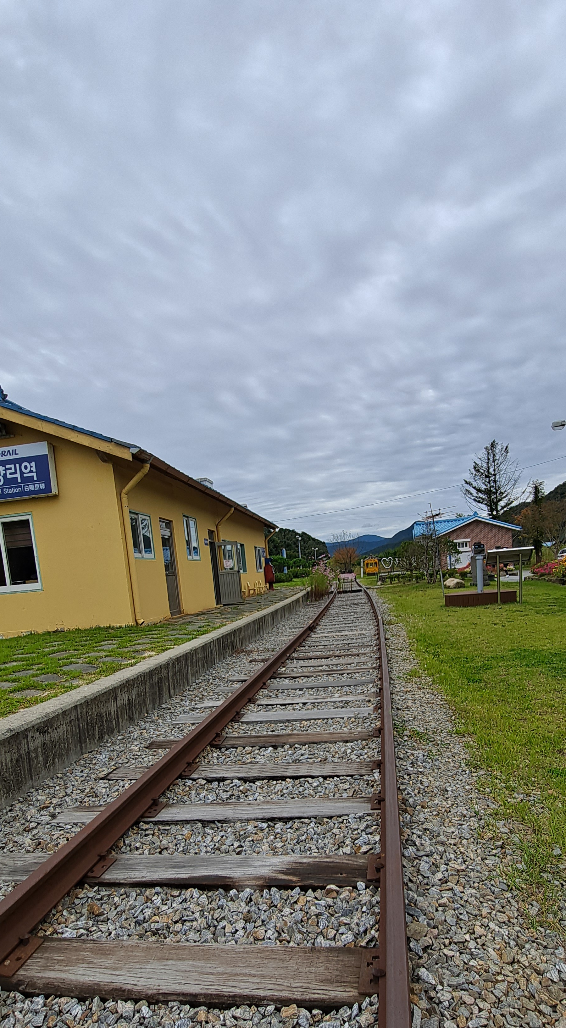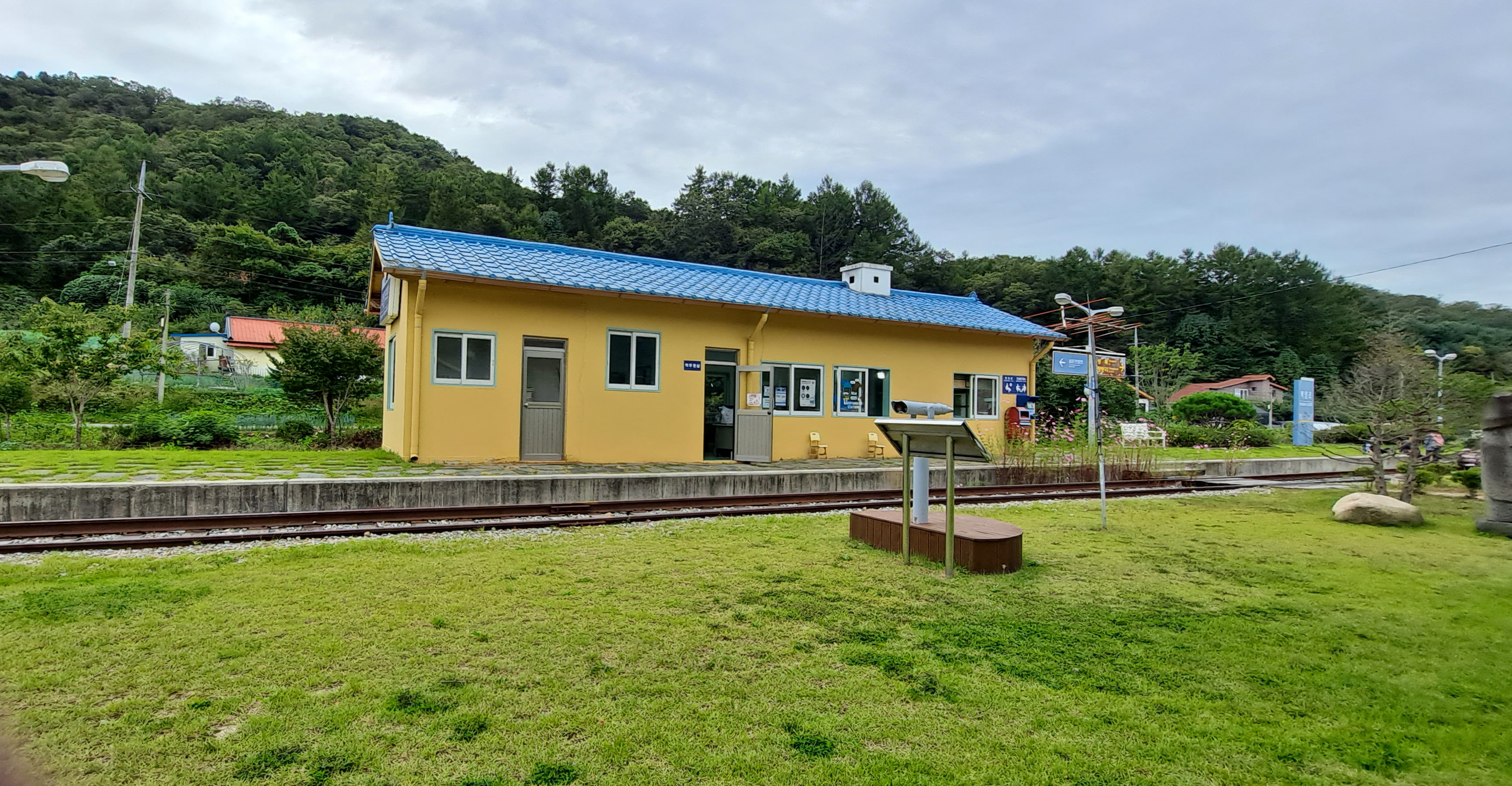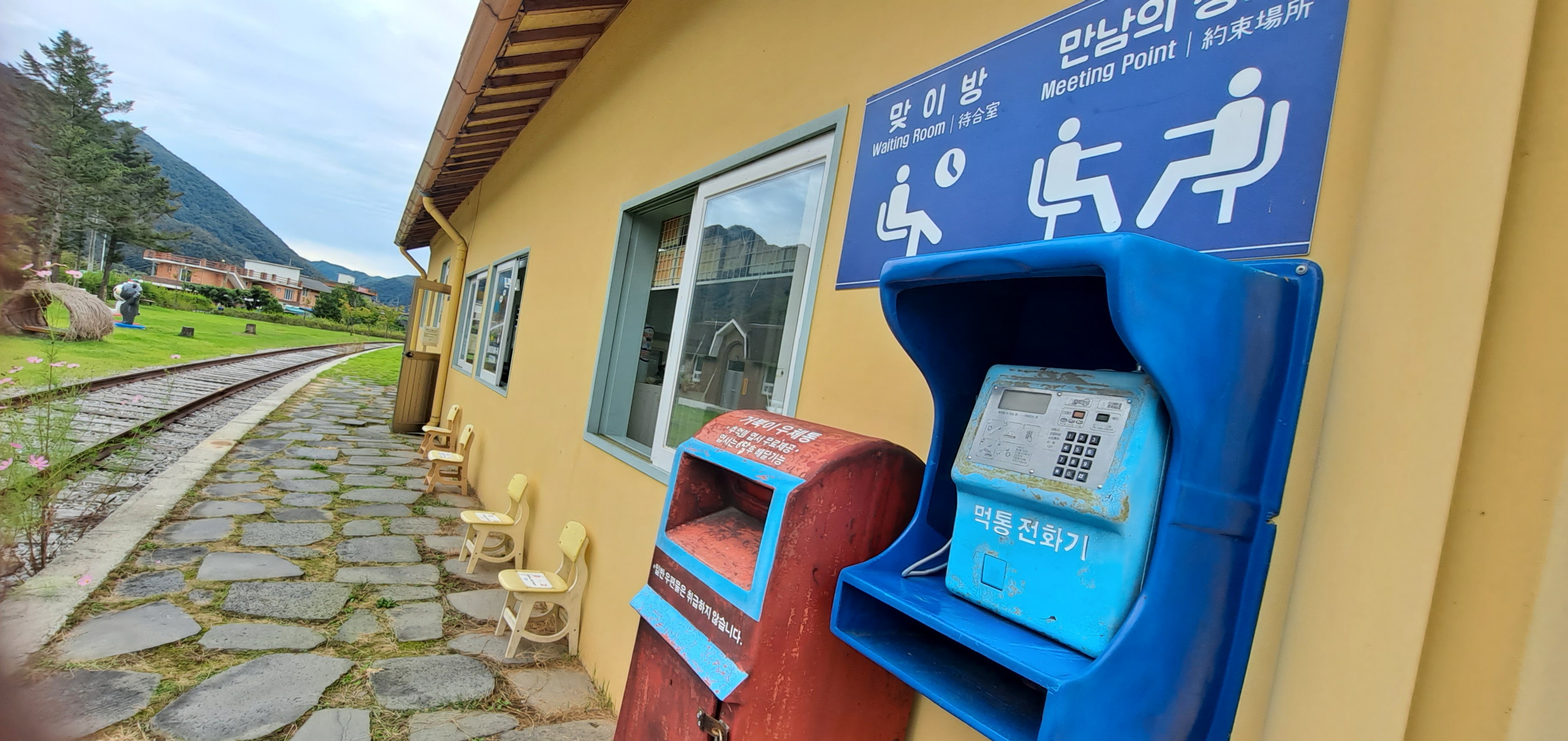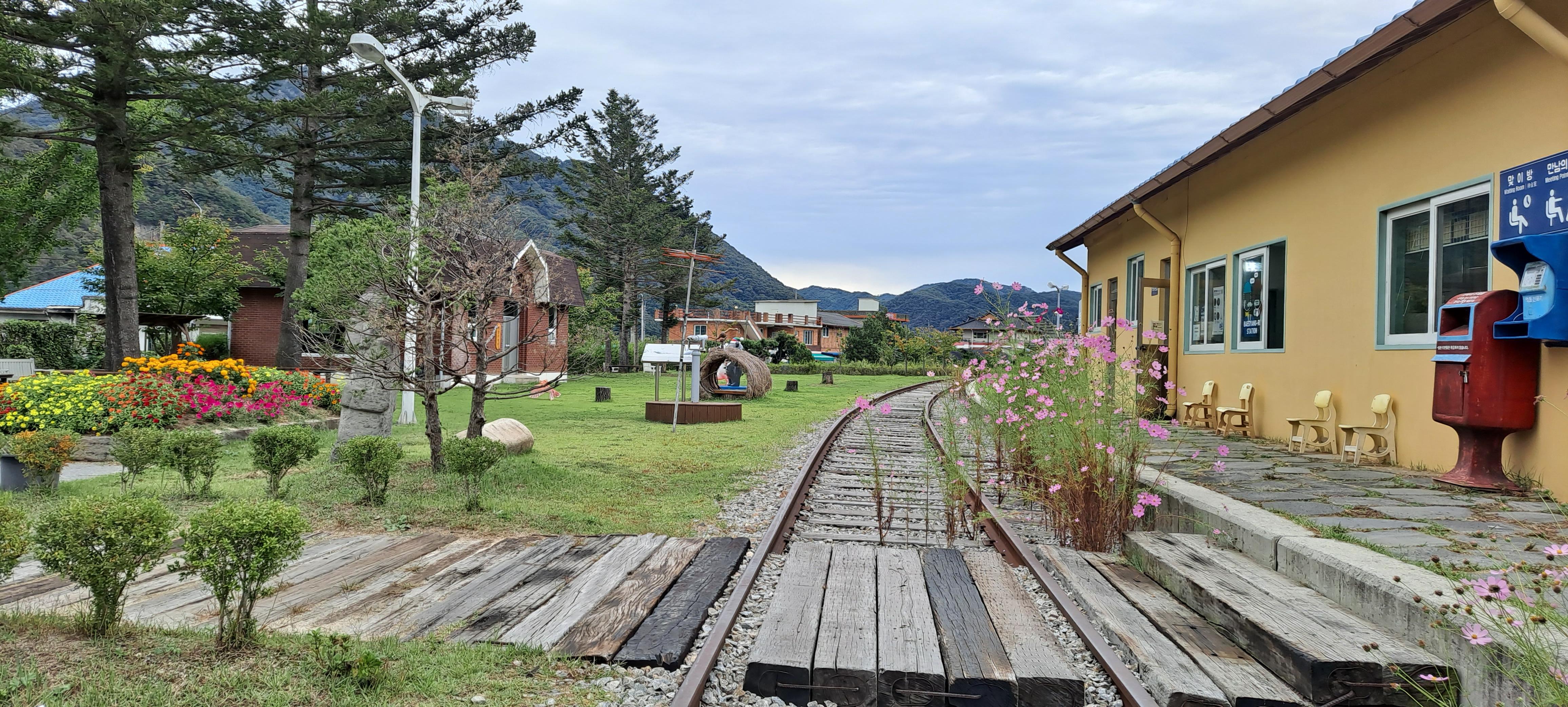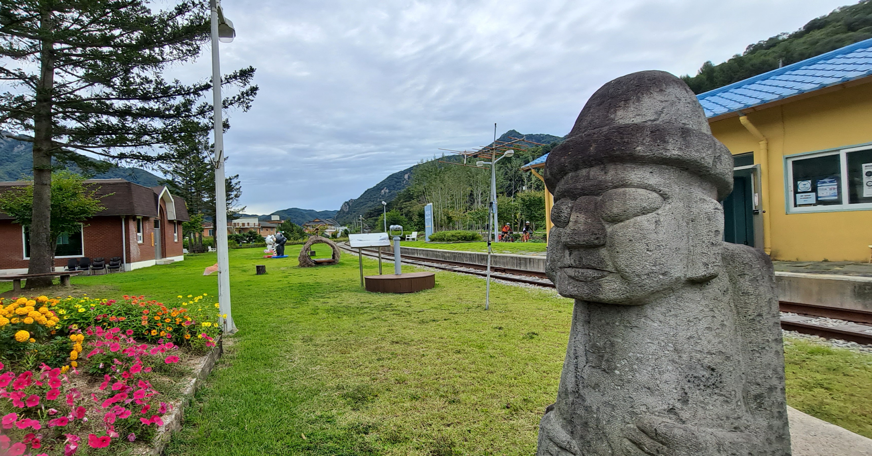기찻길에 코스모스도 피어있고 제주도 돌할아방도 보인다